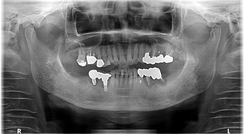 他医院でインプラント治療を行ったが、治療後に「インプラントがグラグラする。」「インプラントが痛い。」などの症状を発症。「インプラントは問題なく埋まっている。咬合調整をすれば症状は改善する。」と言われ、数か月間通院したが一向に改善しなかった。そこで、クリニック長が日本口腔インプラント学会専門医である当院にセカンドオピニオンで来院。